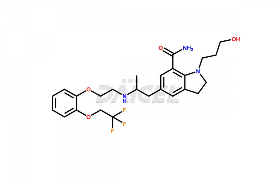The chemical name of Silodosin is 2,3-Dihydro-1-(3-hydroxypropyl)-5-[(2R)-2-[[2-[2-(2,2,2-trifluoroethoxy)phenoxy]ethyl]amino]propyl]-1H-indole-7-carboxamide. Its chemical formula is C25H32F3N3O4, and its molecular weight is approximately 495.5 g/mol.