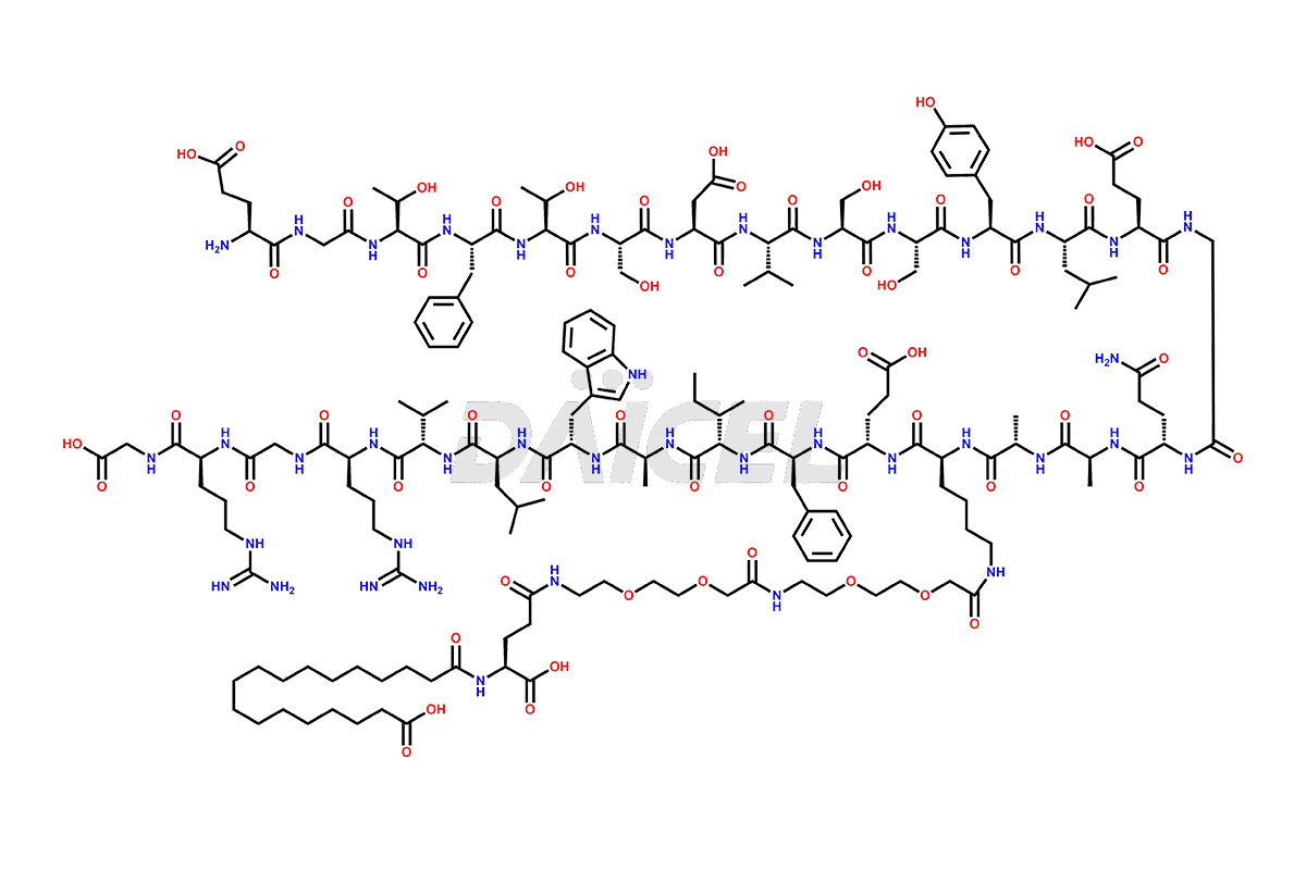 | IUPAC Name | H-Glu-Gly-Thr-Phe-Thr-Ser-Asp-Val-Ser-Ser-Tyr-Leu-Glu-Gly-Gln-Ala-Ala-Lys -(AEEAc-AEEAc-γ-Glu-17-carboxy heptadecanoyl)-Glu-Phe-Ile-Ala-Trp-Leu-Val-Arg-Gly-Arg-Gly-OH |