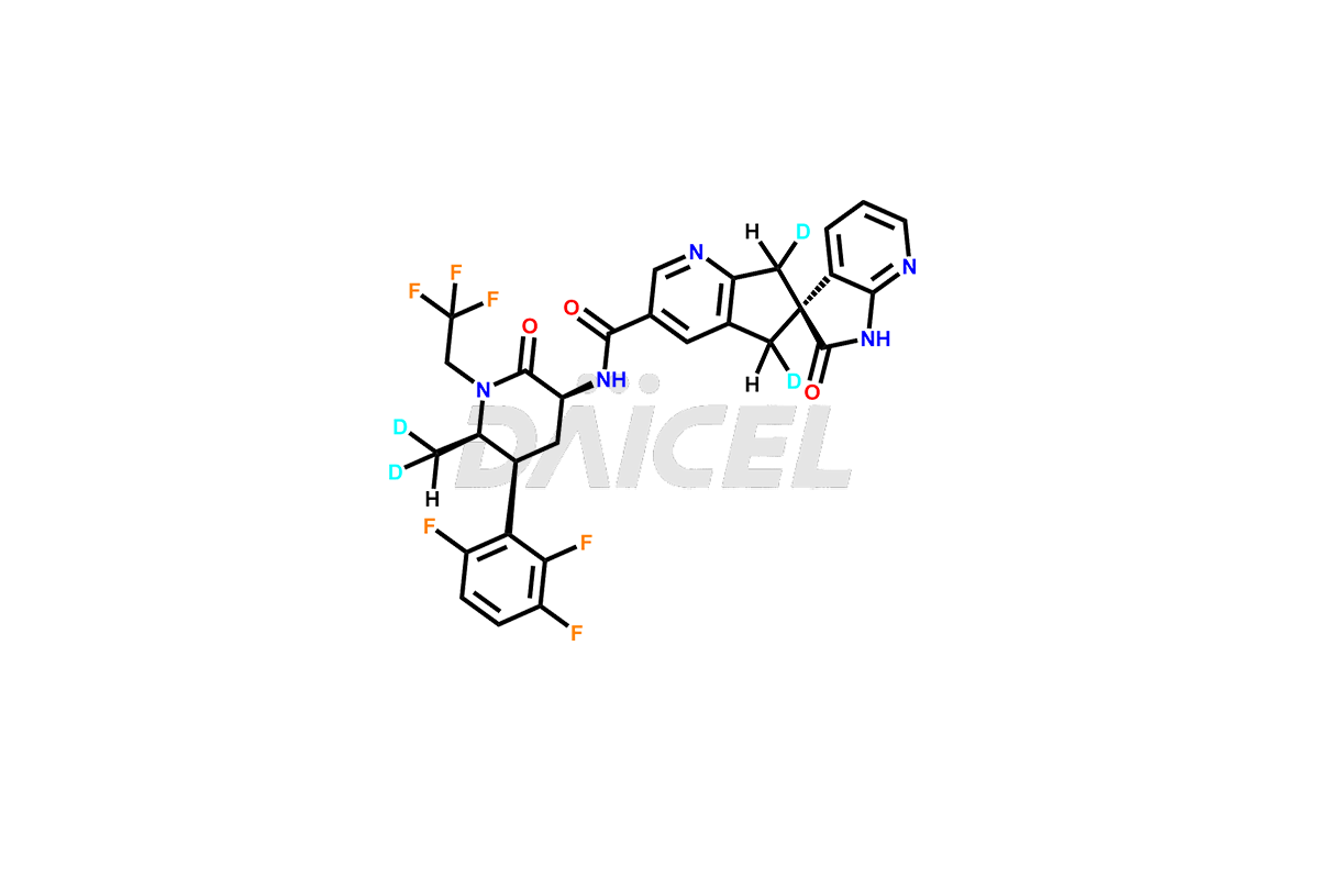 | IUPAC NAME | (S)-N-((3S,5S,6R)-6-(methyl-d)-2-oxo-1-(2,2,2-trifluoroethyl)-5-(2,3,6-trifluorophenyl)piperidin-3-yl)-2'-oxo-1',2',5,7-tetrahydrospiro[cyclopenta[b]pyridine-6,3'-pyrrolo[2,3-, b]pyridine]-5,5,7,7-d4-3-carboxamide |