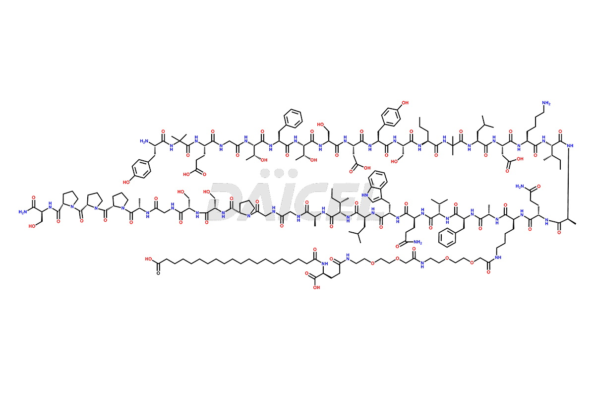 | IUPAC Name | H-Tyr-Aib-Glu-Gly-Thr-Phe-Thr-Ser-Asp-Tyr-Ser-Nva-Aib-Leu-Asp-Lys-Ile-Ala-Gln-Lys(AEEAc-AEEAc-γ-Glu-18-carboxy nonadecanoyl)-Ala-Phe-Val-Gln-Trp-Leu-Ile-Ala-Gly-Gly-Pro-Ser-Ser-Gly-Ala-Pro-Pro-Pro-Ser-NH2 |